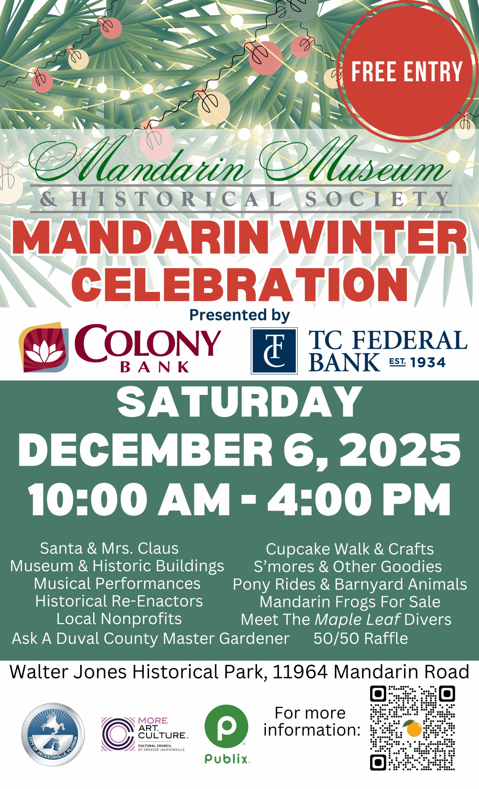 Mandarin Museum will host its annual Mandarin Winter Celebration Presented by Colony Bank and TC Federal Bank on Saturday, December 6, 2025 throughout Walter Jones Historical Park, located at 11964 Mandarin Rd. This FREE event will be filled with festive fun for the entire family, including: